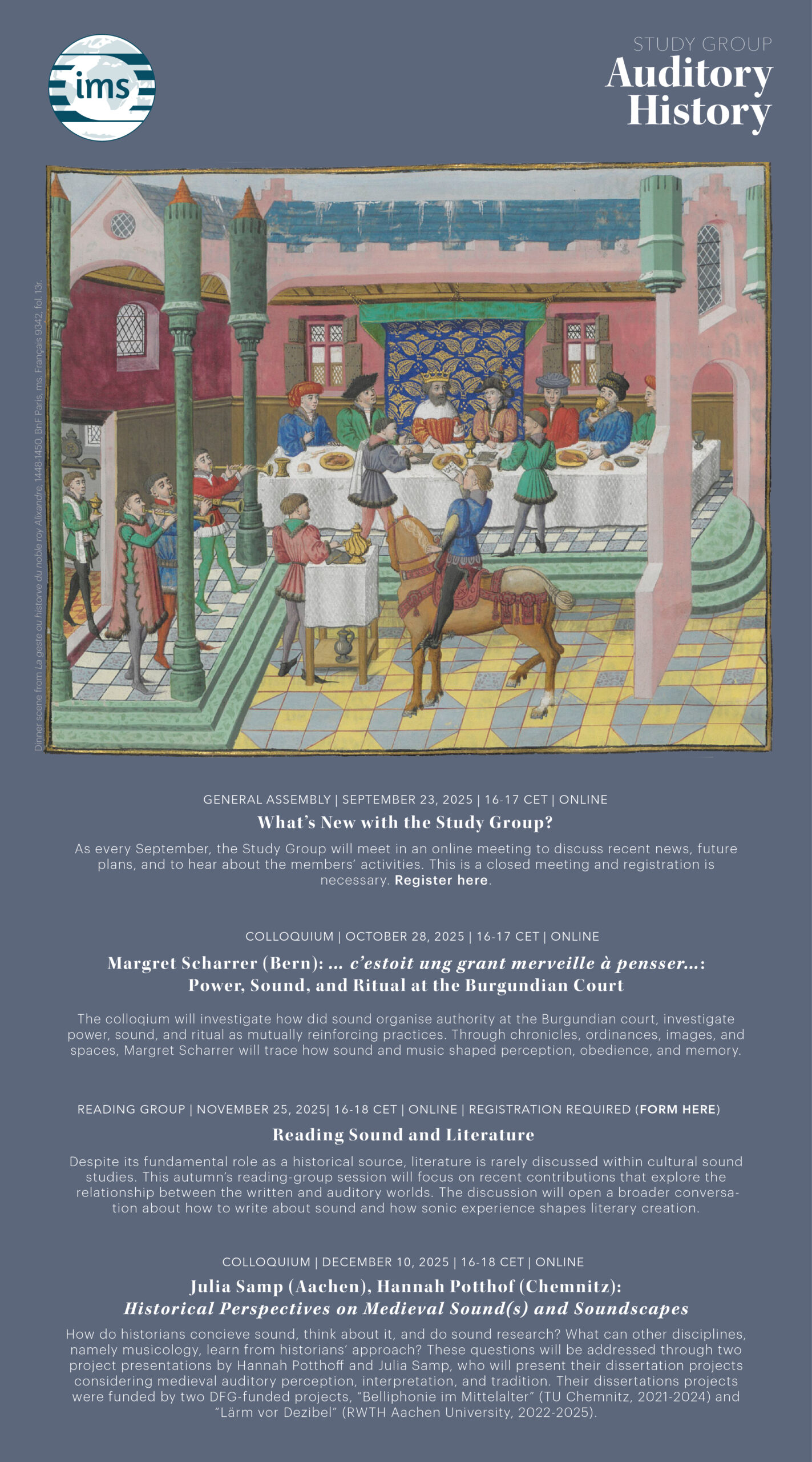 The participation in the events is open to everyone: there is no obligation to be an official member of the IMS or the Study Group. To obtain the Zoom-link for the events, please contact the chairs of the group via email.